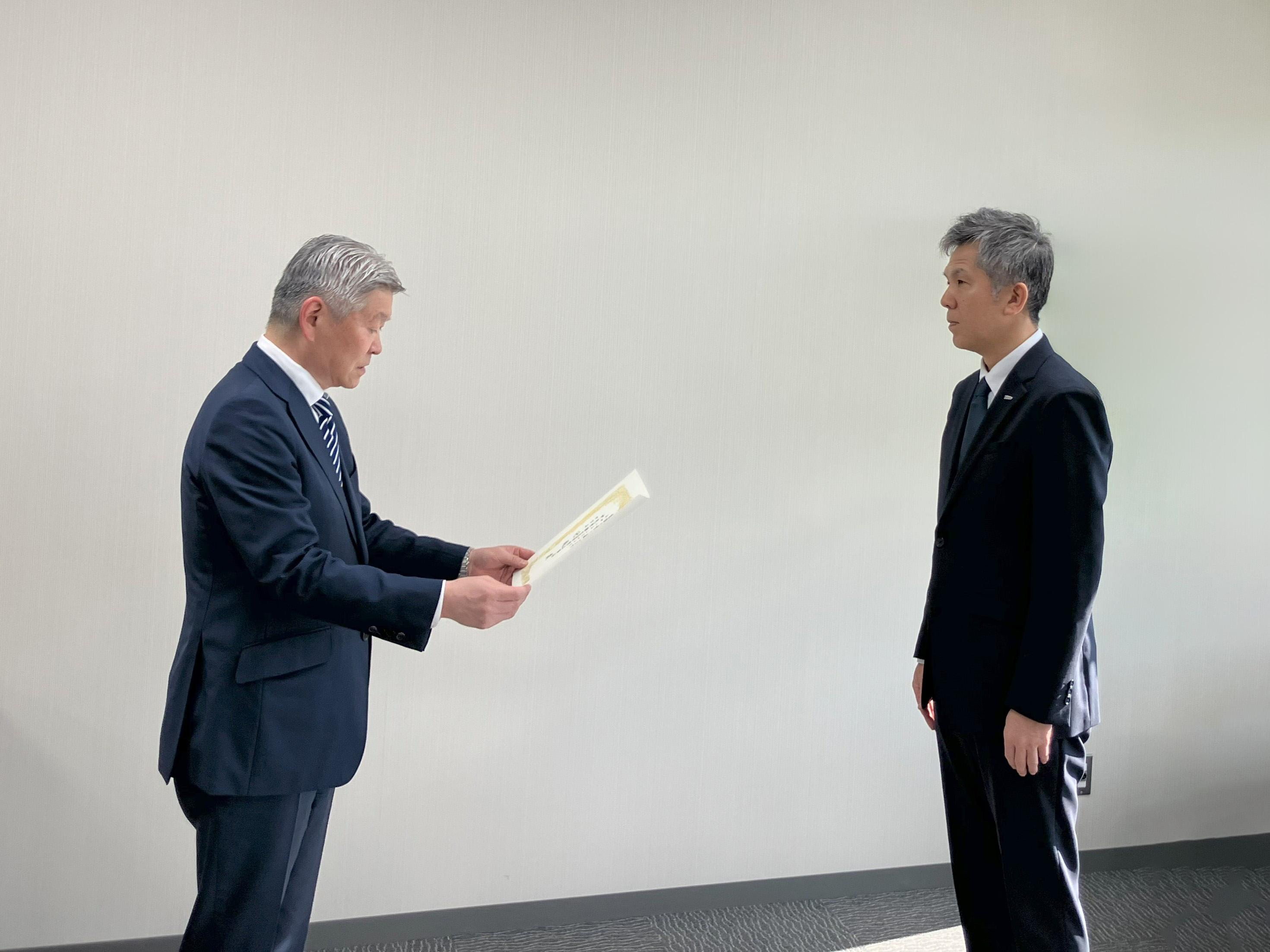 感謝状を受ける 松本 哲哉 代表取締役社長(写真右)