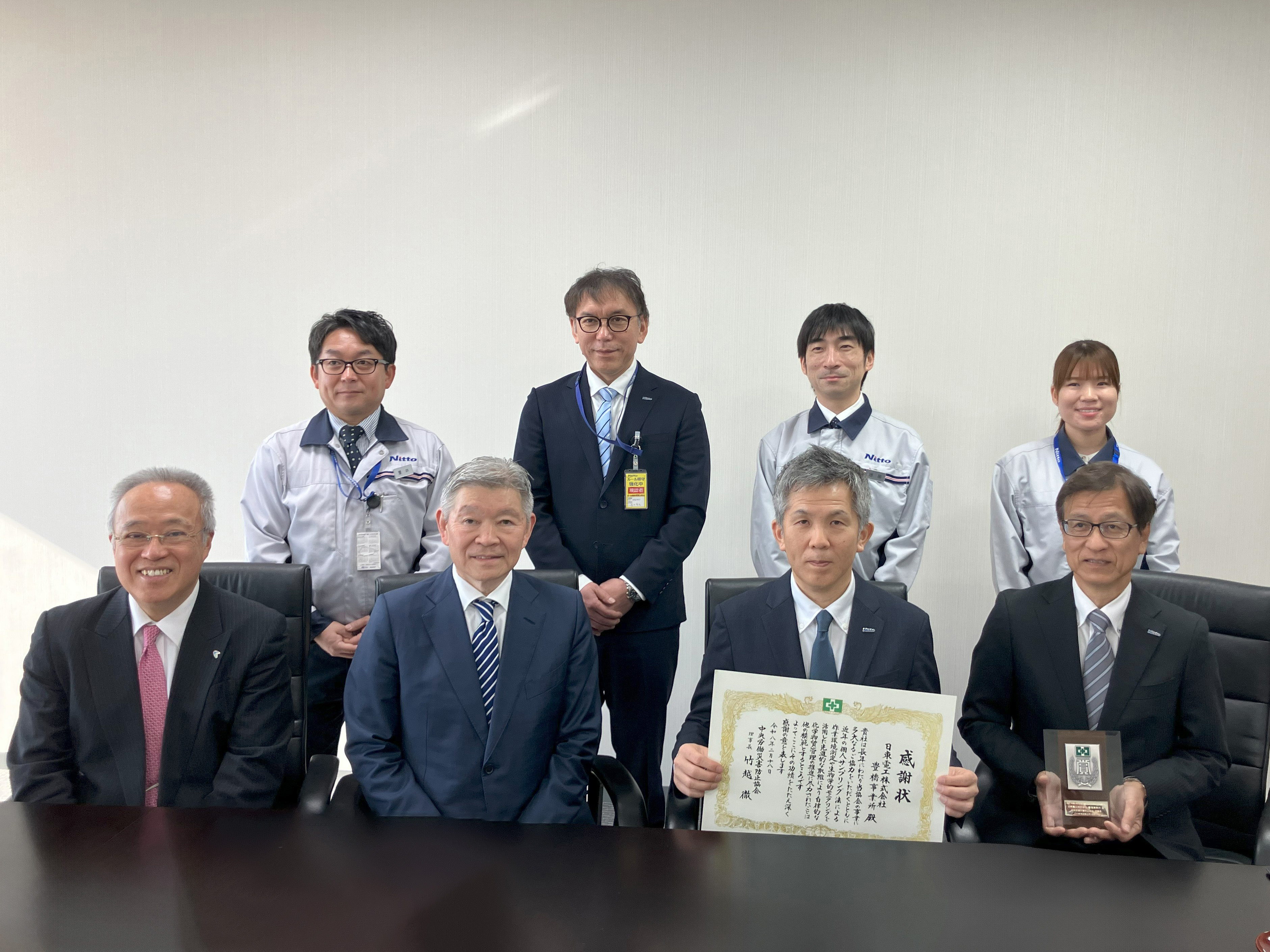 写真後列右から中桐 春佳・基盤機能材料事業部門 環境安全部 安全課、岩田 淳・安全課、髙木 智弘・豊橋環境安全部副部長、夏井 正頼・企画課