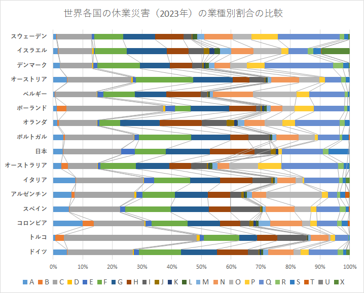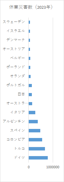資料出所:ILO https://ilostat.ilo.org/ Cases of fatal occupational injury by economic activity | Annual Downloaded from ILOSTAT on 12/9/2025. 2023年で50,000人以上の休業災害報告の国を選んだ。