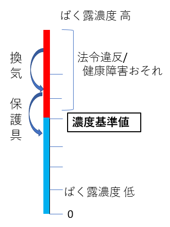 ⇒推定値が濃度基準値に近いときは、超えるおそれがあるため、個人ばく露測定をして実測をすることとされています。
