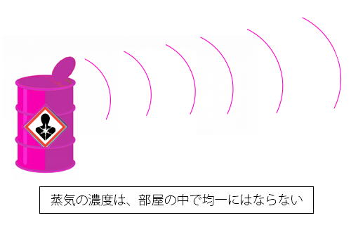 作業者が吸い込むシンナーの蒸気の濃度は、容器近くと部屋の隅では違います。風上と風下とでも濃度はちがいますね。